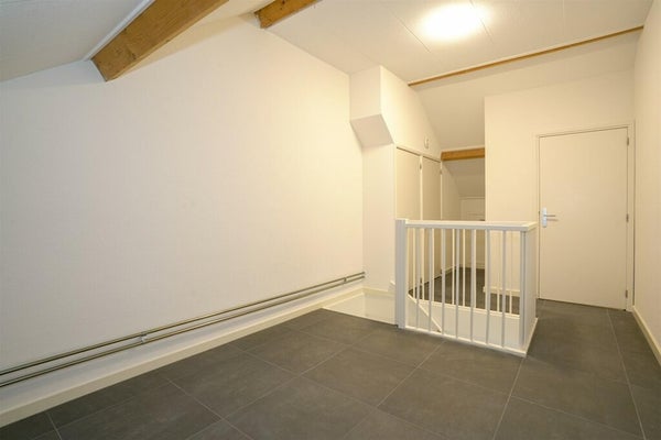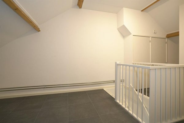 De overloop is een grote ruimte die je deels kunt gebruiken als werk-, studeer- of hobbyruimte. Aan de voorzijde zijn een nieuwe extra toiletruimte gerealiseerd en een praktische berging in de schuinte van het dak. De toiletruimte is ingedeeld met een wandcloset en een wastafel met badmeubel.