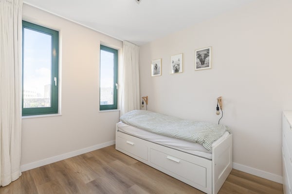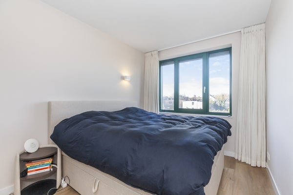 De overloop geeft toegang tot 2 slaapkamers, de badkamer en een berging. Slaapkamer I is gelegen aan de voorzijde van de woning en is voorzien van vaste kasten. Slaapkamer II is gelegen aan de achterzijde van de woning. De moderne badkamer is volledig betegeld en voorzien van een inloopdouche, wastafel met meubel en een zwevend toilet.