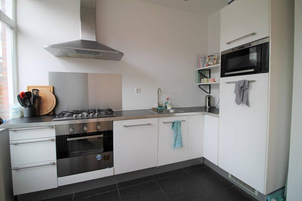 De lichte woonkamer van ca. 9,40 x 3,60 m. beschikt over een sfeervolle gashaard en openslaande deuren naar de zonnige achtertuin. Aansluitend vindt u de open keuken van ca. 3,20 x 1,70 m., praktisch ingericht en van alle gemakken voorzien.