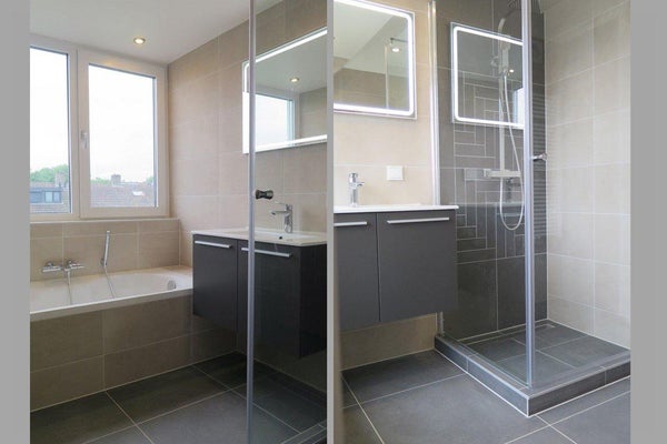 Ruime badkamer met inloopdouche, bad en wastafel.