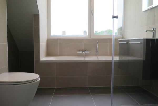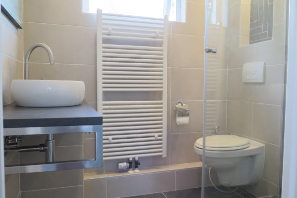 Moderne badkamer met inloopdouche, aparte wastafel en toilet.
