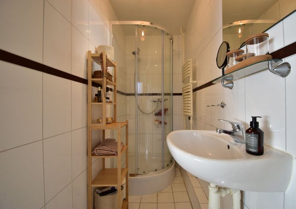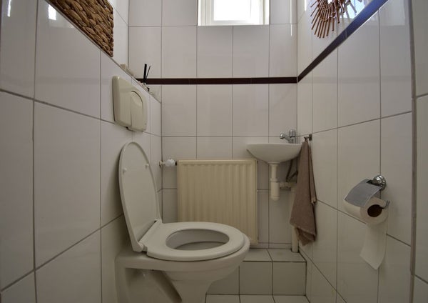 Op de begane grond vindt men tevens de badkamer voorzien van een wastafel en douche en een separaat toilet.