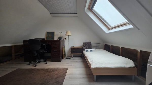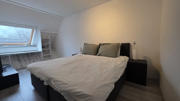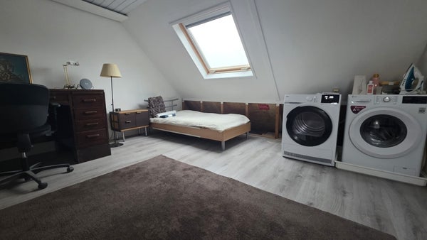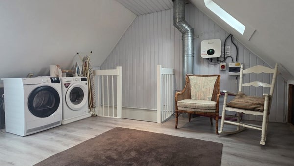 De zolderverdieping herbergt de wasmachine en droger en biedt daarnaast nog een extra slaapplek met een eenpersoonsbed. Een ideale ruimte voor logees of als extra werk- of hobbykamer.