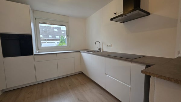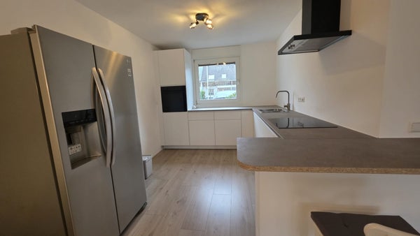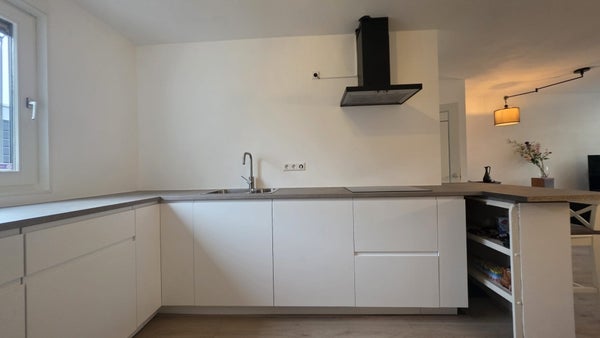 Aansluitend bevindt zich de open keuken, die dankzij de indeling perfect in verbinding staat met de eethoek en woonkamer. De keuken is uitgerust met moderne apparatuur: koel-vriescombinatie, inductiekookplaat, afzuigkap, oven, vaatwasser. Daarnaast beschikt de keuken aan meer dan voldoende opbergruimte.