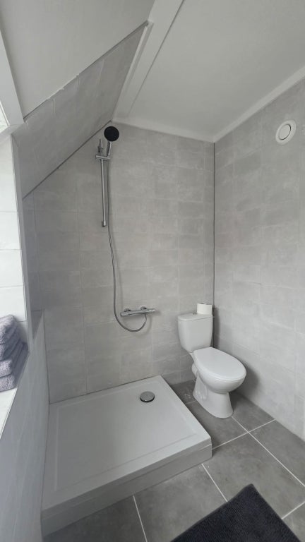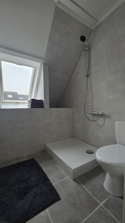 De badkamer is uitgerust met een douche, wastafel en toilet.