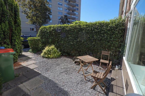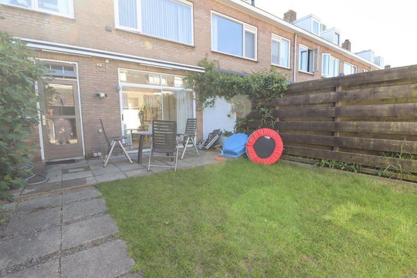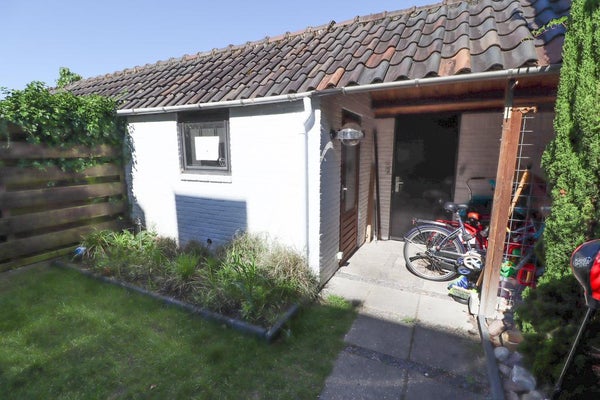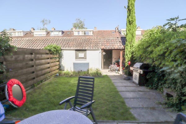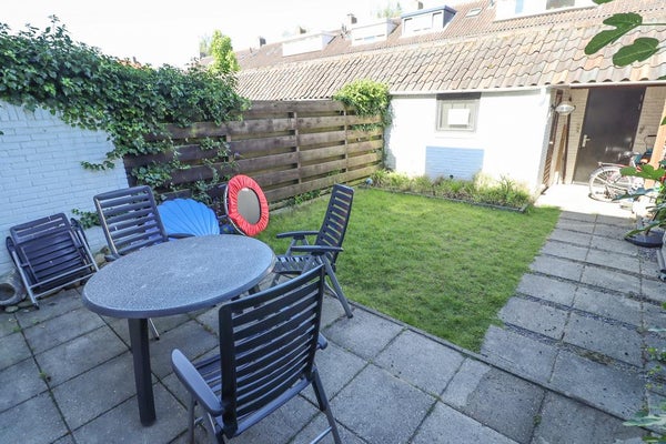 De zonnige tuin (ca. 45m²) is deels betegeld en deels voorzien van gras en heeft de beschikking over een schuurtje en een achterom.