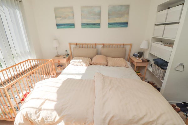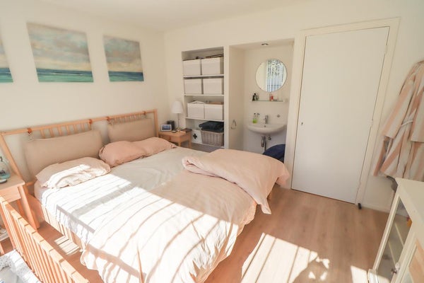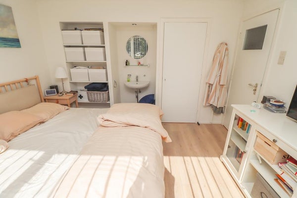 Slaapkamer 1 (ca. 12m²) beschikt over een wastafel en inbouwkasten en is gelegen aan de voorzijde van de woning.