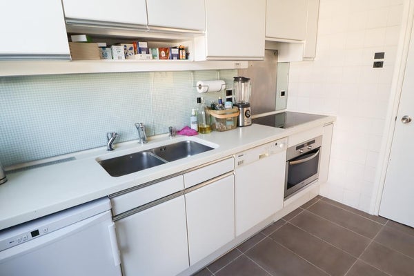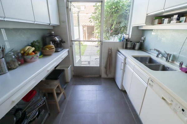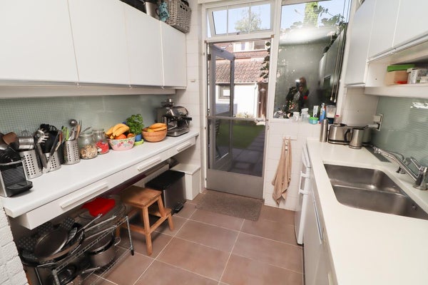 De aparte keuken (ca. 7,5m²) heeft een rechte opstelling aan beide zijden en is voorzien van een spoelbak, een kookplaat, een oven, een afzuigkap, een vaatwasser, een koel-vriescombinatie en diverse onder- en bovenkasten. Vanuit de keuken tevens ook toegang naar de tuin.
