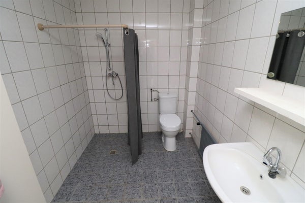 De badkamer (ca. 5m²) is basis uitgevoerd en beschikt over een douche en een wastafelmeubel.
