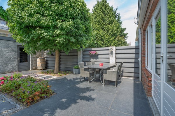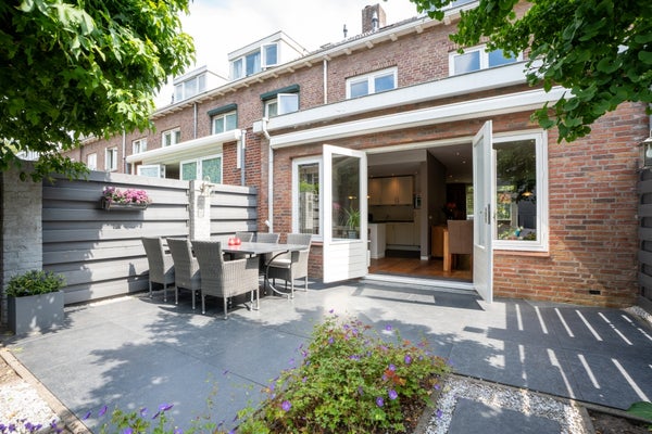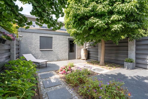 Deze charmante middenwoning heeft een behoorlijke voortuin en een verrassende diepe achtertuin met garage. Door de voortuin krijgt de straat een vriendelijker aanzicht en het zorgt ook voor meer privacy in de woning. Vanuit de voortuin kijkt u schitterend vrij uit over een park met aansluitend "De Mark". De aantrekkelijk diepe, keurig onderhouden achtertuin ligt perfect op het zuidwesten. Door de tuindiepte en de bebouwing kunt u altijd zelf bepalen of u in de zon wilt zitten. Via de achtertuin is de garage te bereiken.