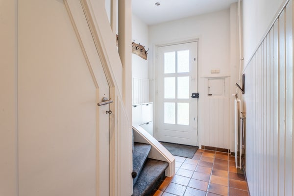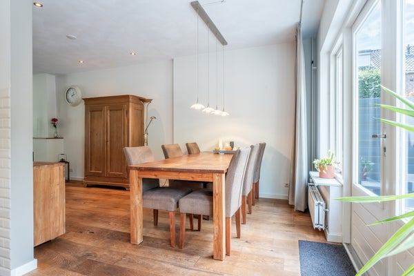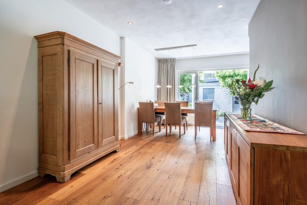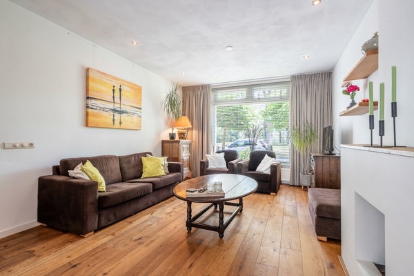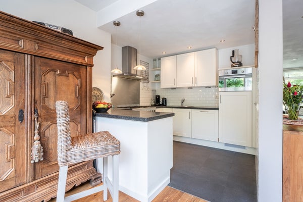 Via de hal zijn de trapopgang naar de 1e verdieping, het toilet en de sfeervolle woonkamer toegankelijk. De ruime woonkamer heeft o.a. een "warme" houtkleurige vloer, een strakke openhaard en openslaande deuren naar de tuin. Door deze royale raampartijen komt er veel natuurlijk daglicht binnen. Dit geldt overigens voor de gehele woning. De semi-open inbouwkeuken ligt aan de achterzijde, heeft een groot achtergevelraam met uitzicht op de zonnige achtertuin. Deze nette inbouwkeuken met een handige kastenwand, is o.a. uitgerust met een rvs design afzuigkap, een groot fornuis, een oven, een vaatwasmachine en een koelkast. In de kelder is nog een extra koelkast beschikbaar.