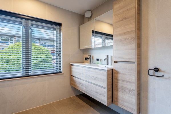 De recent vernieuwde badkamer heeft een ruime inloopdouche net sunshower, mooi wastafelmeubel met dubbele wastafel, designradiator en toilet.
