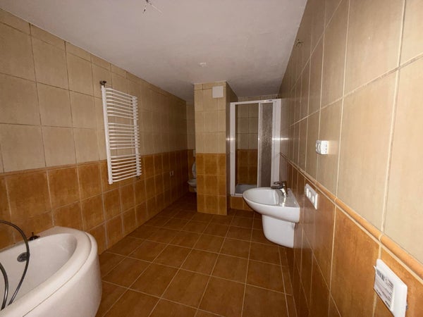 De betegelde badkamer is voorzien van een ligbad, wastafel en designradiator.