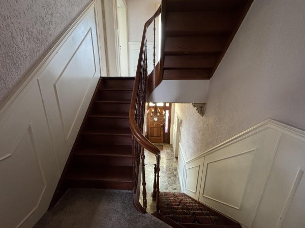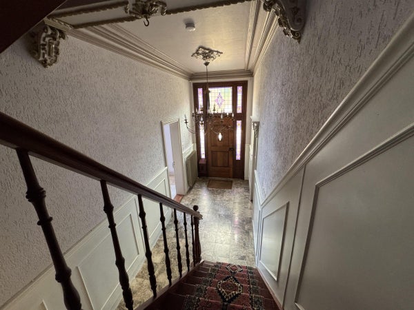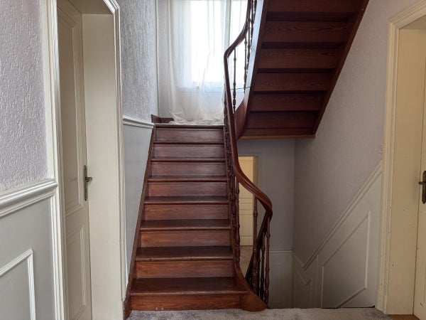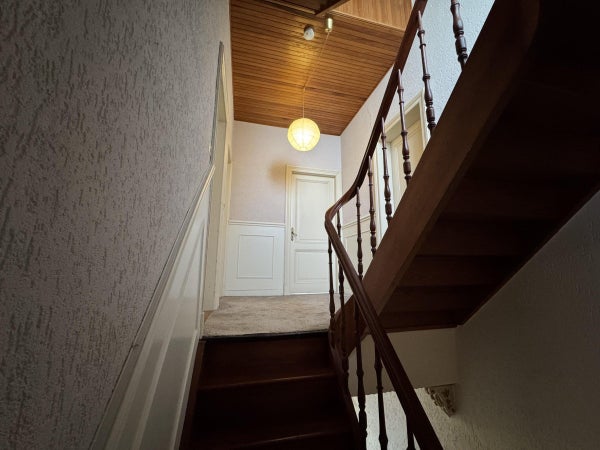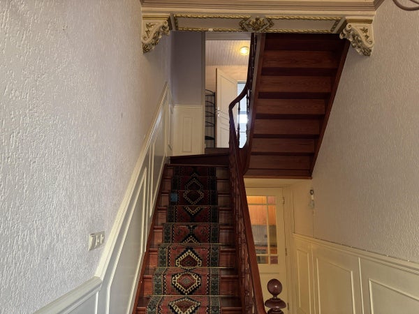 Via de prachtige authentieke trap bereiken we de halve verdieping waar zich de ruime badkamer bevindt en de eerste van de in totaal 5 slaapkamers. De badkamer en slaapkamer bevinden zich aan de achterzijde van de woning.