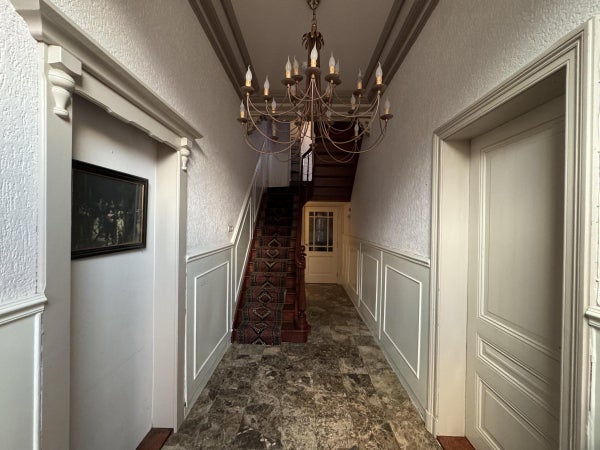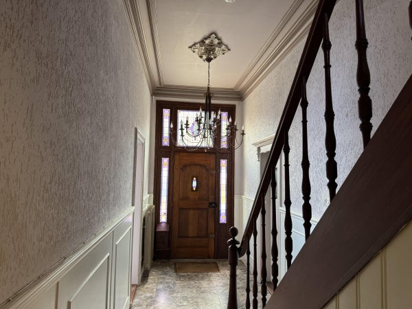 Bij binnenkomst in de authentieke ruime hal vinden we de trapopgang naar de eerste verdieping. Rechts bevindt zich de "voorkamer" welke af te sluiten is met schuifdeuren van de "achterkamer".