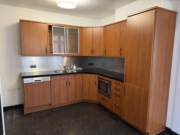 De keuken is in hoekopstelling en beschikt over alle wenselijke (inbouw) apparatuur waaronder een koelkast met aparte grote vriezer, combinatie oven/magnetron, een vaatwasser, elektrische kookplaat met afzuigkap en natuurlijk een vaatwasser.