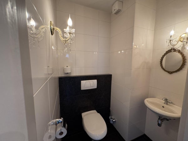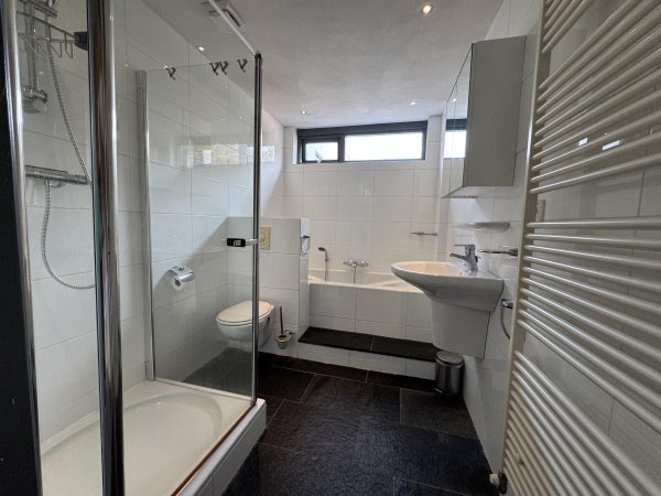 De badkamer heeft een ligbad en ook een aparte douche, daarnaast is hier het 2e toilet aanwezig en een wastafel met design radiator.