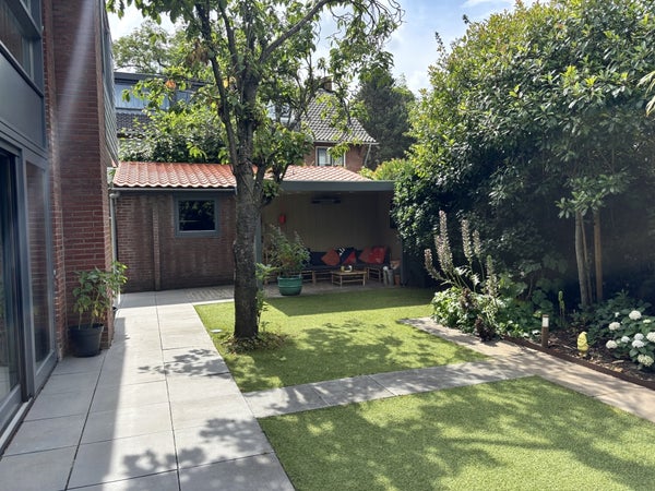 Het huis heeft rondom een prettige tuin met in de achtertuin (gelegen op het zuidwesten) veel privacy. Er zijn twee overkappingen, één voorzien van een loungeset met verwarming en muziek, de ander met buitenspeelkeuken of te gebruiken om de tuintafel onder te zetten. Een groot zonnescherm biedt een fijne schaduwplek. Er is ook een grote trampoline aanwezig.