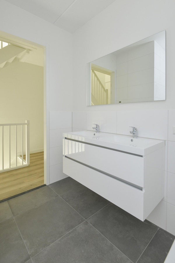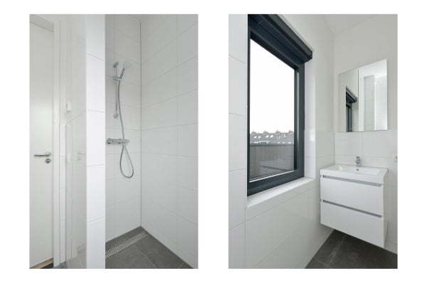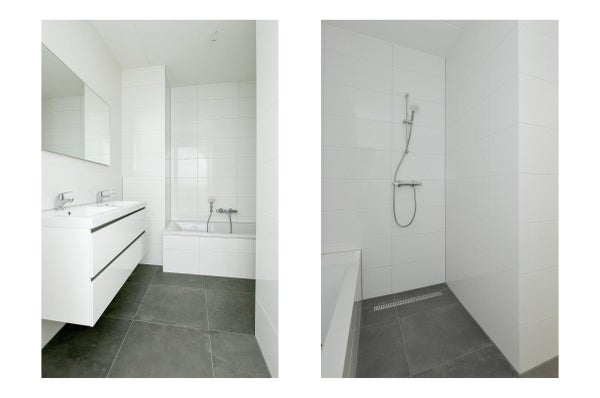 De moderne badkamer is voorzien van een ligbad, douche en een wastafelmeubel met spiegel. In de berging treft u de aansluitingen voor de wasmachine.