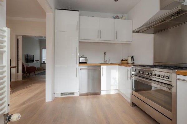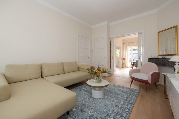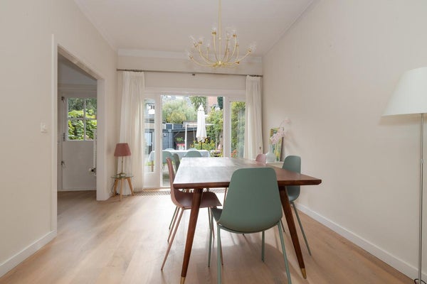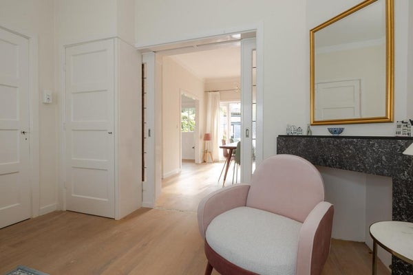 Entree, vestibule, gang, trapkast, toilet, sfeervolle kamer en suite met schuifdeuren met glas in lood, originele authentieke schouw en openslaande deuren naar de tuin. De woonkamer is voorzien van een houten delen vloer. Open keuken met diverse inbouwapparatuur zoals een koel-vriescombinatie, SMEG gasfornuis met brede oven, afzuigkap en vaatwasser. De achterkamer met de open keuken zijn door de openslaande deuren lekker licht en op zomerse dagen is de tuin en het terras een verlengde van de woonruimte. De voorkamer is een lekkere plek om een boek te lezen en tv te kijken.