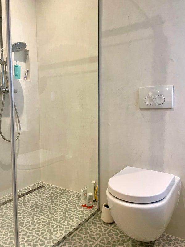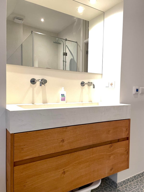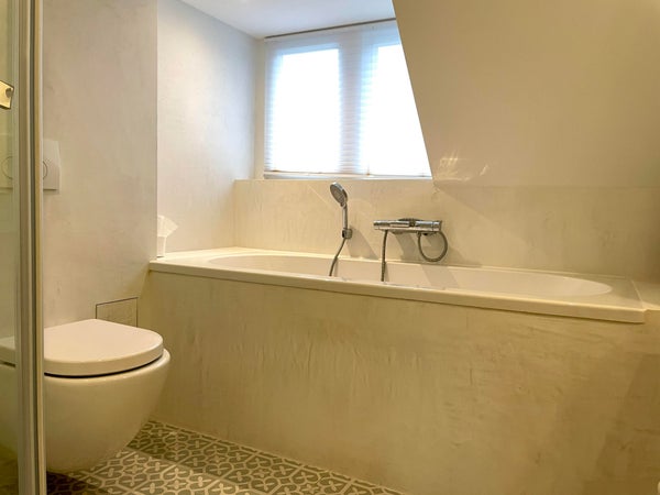 Badkamer met douche, toilet, ligbad en grote spigel met badkamermeubel.