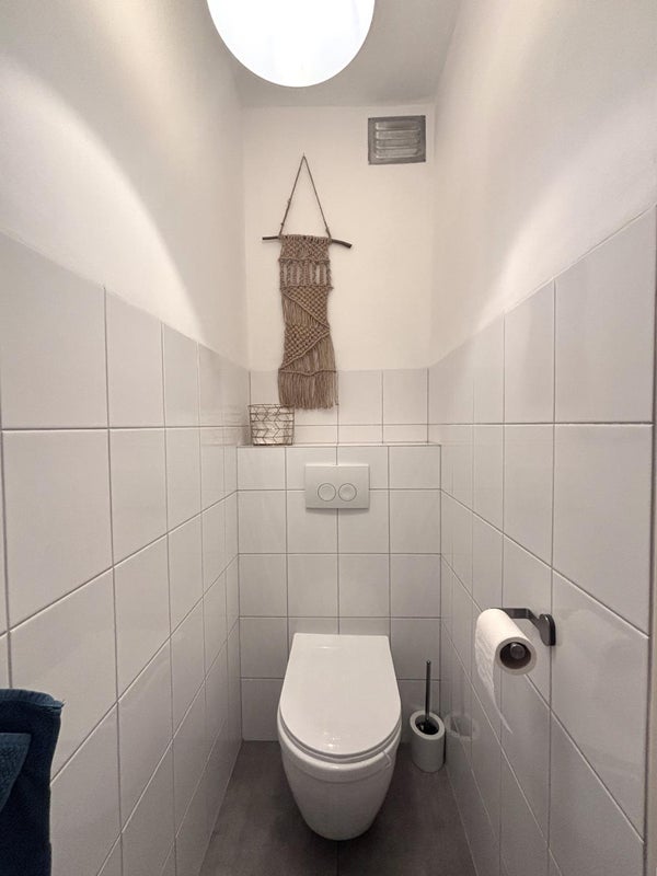 Bij binnenkomst in de ruime hal heeft u toegang tot het toilet en de woonkamer met open keuken. De moderne keuken is volledig uitgerust met een inductiekookplaat, afzuigkap, koelkast met vriesvak, oven en vaatwasser.