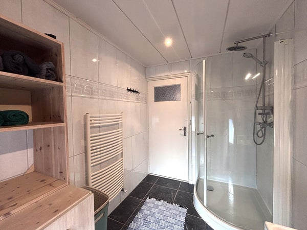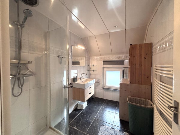Via de trap bereikt u de eerste verdieping, waar zich twee ruime slaapkamers en een moderne badkamer bevinden. De slaapkamers zijn voorzien van veel natuurlijk licht, terwijl de badkamer is ingericht met een douche, wastafel en toilet. Deze verdieping biedt een prettige balans tussen comfort en functionaliteit, ideaal voor dagelijks gebruik.