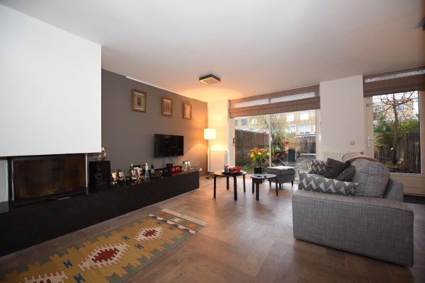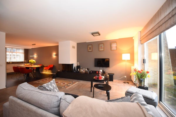 De woonkamer ligt aan de achterzijde en is voorzien van een sfeervolle houthaard en schuifpui naar de royale tuin (die onderhoudsarm is!). De tuin is tevens via een achterom te bereiken en is voorzien van een handige berging.