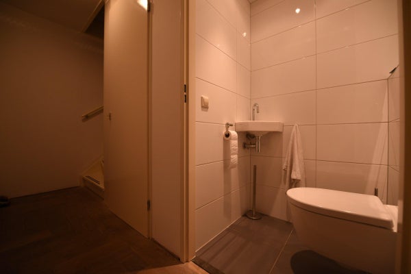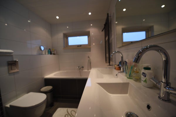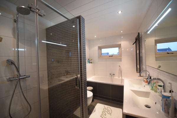 De badkamer is voorzien van een dubbele wastafel, 2e toilet, ruime doucheruimte en ligbad.