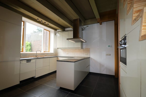 U komt binnen in de grote hal met hardstenen vloer. De woonkamer is en suite met in het achterste gedeelte daarvan de compleet nieuwe woonkeuken, die van alle moderne apparatuur is voorzien. Aan de achterzijde van de woning is een aanbouw met daarin een bijkeuken waar zich de aansluiting van de wasmachine bevindt.