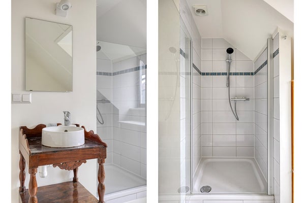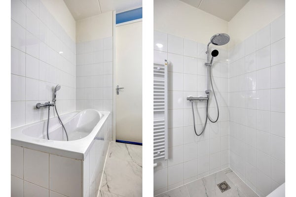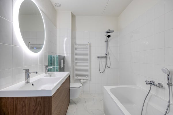 De nieuw gerenoveerde badkamer is in dezelfde stijl als het toilet en beschikt over een fijn ligbad, inloopdouche, dubbele wastafel met kastruimte en spiegel met ledverlichting.