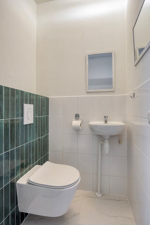 Het nieuw gerenoveerde toilet is voorzien van een zwevend toilet en wasbak met spiegel.