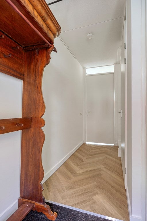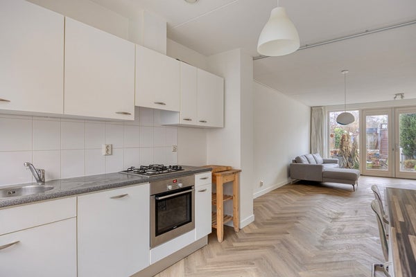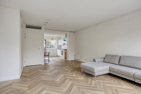 De zeer lichte en ruime woonkamer beschikt over ruime raampartijen en uitzicht over de fijne achtertuin. De gehele beneden verdieping is voorzien van nieuwe pvc-vloer met visgraatmotief wat de woning een moderne uitstraling geeft.