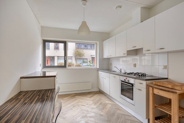 Er is voldoende plek voor het creëren van een fijn zit- en eetgedeelte. De openkeuken is voorzien van diverse benodigde inbouwapparatuur waaronder vaatwasmachine, oven en gaskookplaat. In de hoek is er plek voor een ruime koelkast met vriezer.