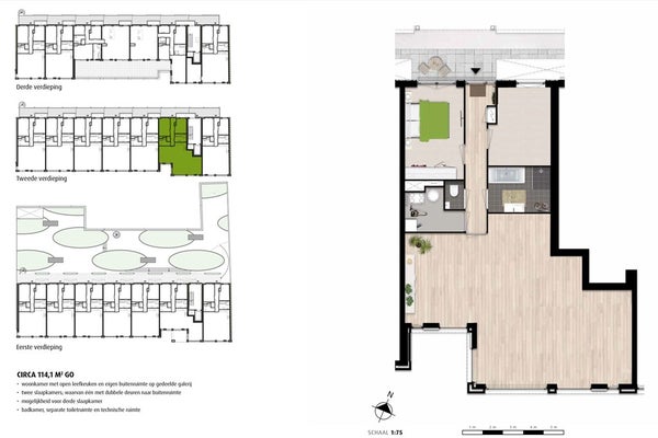 Je eigen appartement bevindt zich op de tweede verdieping. Eenmaal binnen kom je op het ruime balkon aan de portiekzijde, met een fraai uitzicht op de tuin beneden. Het balkon is voorzien van een comfortabele loungeset en biedt een perfecte plek om in zowel zomer als winter van buiten te genieten.