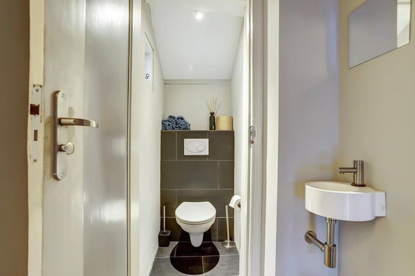 Overloop met toilet. Entree naar de bijzonder sfeervolle slaapkamer met schouw, fraai balkenplafond en prachtig uitzicht over de grachtengordel. Ruime inloopkast/waskamer met wasmachine aansluiting en openslaande deuren naar het beschut dakterras op het noordwesten met veel privacy.
