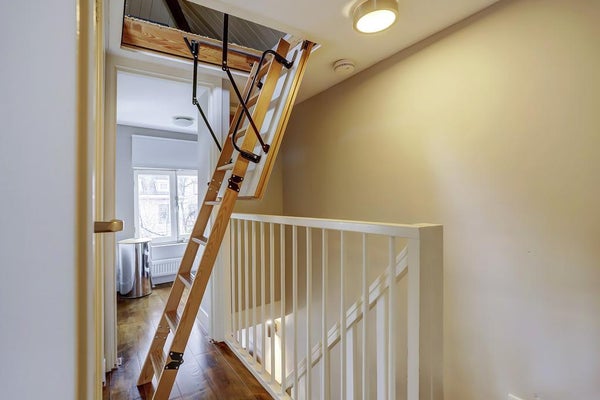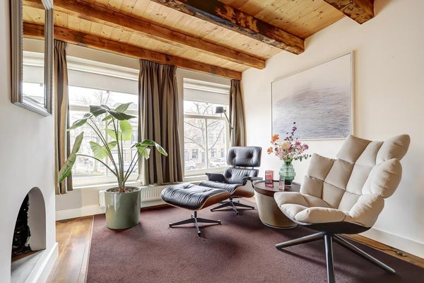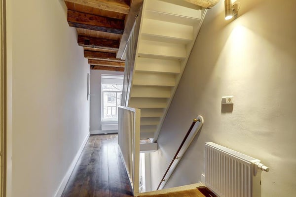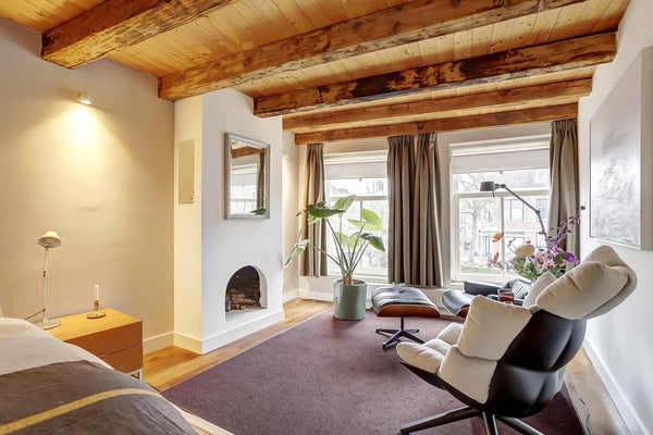 Overloop met toilet. Entree naar de bijzonder sfeervolle slaapkamer met schouw, fraai balkenplafond en prachtig uitzicht over de grachtengordel. Ruime inloopkast/waskamer met wasmachine aansluiting en openslaande deuren naar het beschut dakterras op het noordwesten met veel privacy.