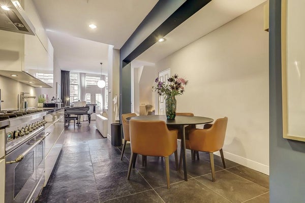 Entree met kleine hal, meterkast en trapopgang naar de 1e verdieping. Ruime woonkamer en eetkeuken met openslaande deuren naar de grachtzijde met eigen stoep met plek voor een bankje. De woonkamer is voorzien van een houten vloer. Nette keuken aan de achterzijde gelegen en voorzien van 6 pits gasfornuis met dubbele oven, afzuigkap, combimagnetron, vaatwasser, koelkast, vriezer, wijnkoeler en espressoapparaat.