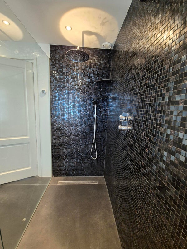 Ruime badkamer welke is voorzien van een ligbad, inloopdouche, dubbele wastafel en toilet.