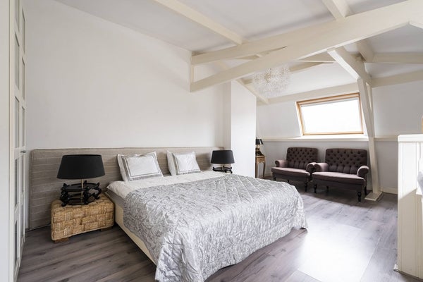 Trap naar de tweede verdieping, waar zich twee ruime slaapkamers bevinden. Klein overloop geeft toegang tot alle kamers. Deze verdieping is ook voorzien van een visgraatvloer. De hoofdslaapkamer aan de voorzijde heeft een uitzonderlijk vrij uitzicht over de Paleistuin. De slaapkamer aan de achterkant heeft ook een open uitzicht over de achterzijde. Beide kamers zijn voorzien van een tweepersoonsbed. De badkamer, in het midden, is toegankelijk vanuit beide kamers. De badkamer heeft een ligbad met douche en twee wastafels. Apart toilet in de hal.