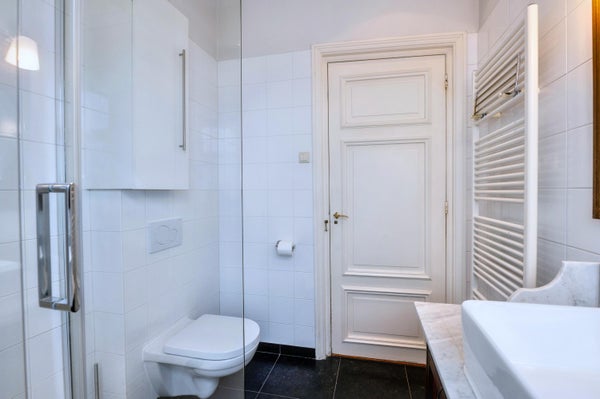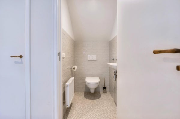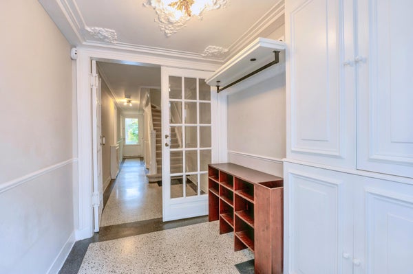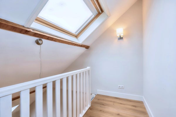 De tweede verdieping heeft twee goed formaat slaapkamers, waarvan er één een balkon heeft dat uitkijkt op de achterkant, een inloopkast, en een badkamer met inloopdouche, wastafel, en wc. Traditionele elementen zoals verfijnde gipsplafonds, schoorsteenkappen, en plankenvloeren completeren de klassieke uitstraling en sfeer van het huis.