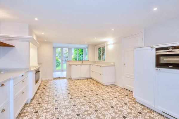 De opvallende eigenschap van deze verdieping is de enorme luxe keuken met vloerverwarming. Het is weelderig uitgerust met twee ovens, een inductiekookplaat, koelkast, vriezer, vaatwasser, en Quooker (boiling water installatie op aanvraag), en heeft een bar-top tafel die het scheidt van de eetkamer. Vanuit hier leiden Franse deuren naar het grote, zonnige (zuidwesten) terras en de tuin die niet alleen mooi is aangelegd, maar ook geen uitzicht heeft en dus prachtig - en ongewoon - privé is.