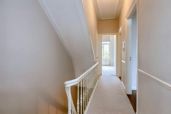 Boven aan de trap naar de eerste verdieping is een overloop met een aparte wc met een antieke Delft Blauwe wastafel, en toegang tot een balkon. Vanaf deze overloop zijn er twee prachtige ontvangstruimtes gescheiden door originele schuifdeuren, een aangrenzende achtergelegen zonnige kamer (zeer geschikt als kantoor), en een kitchenette met magnetron, bar koelkast, en vaatwasser. Hoogtepunten zijn de prachtige decoratieve plafonds van gips, parketvloeren, marmeren open haarden, gedetailleerde kroonluchters, en verbluffende glas-in-loodramen.