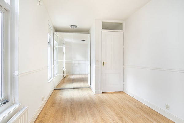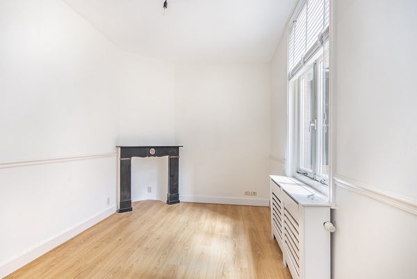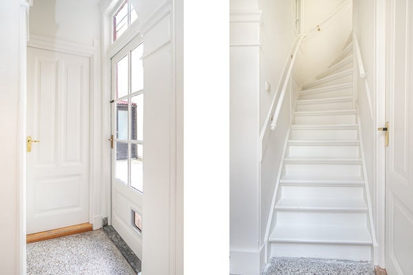 Entree op de begane grond naar een gang met toegang tot een zeer ruime en goed onderhouden woon/eetkamer met prachtige ornamenten op het plafond die kenmerkend zijn voor deze mooie buurt. Vanuit de woonkamer heb je toegang tot een tweede gang die leidt naar de badkamer, keuken, een slaapkamer en de trap naar boven.