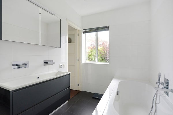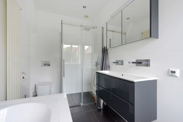 - moderne badkamer gelegen op de eerste etage voorzien van ligbad, inloop douche, wastafelmeubel en toilet.