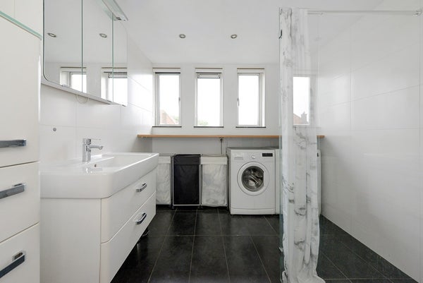 - moderne badkamer gelegen op de tweede etage voorzien van inloop douche, wastafel en ruimte voor een wasmachine en droger.