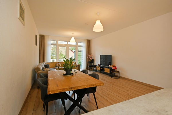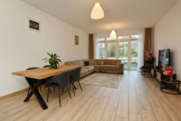 De woning opent met een ruime hal voorzien van toilet met fonteintje. De lichte en royale woonkamer biedt volop ruimte voor een comfortabele zit- en eethoek en toegang tot de zonnige achtertuin. De moderne open keuken is uitgerust met hoogwaardige (nieuwe) inbouwapparatuur.
