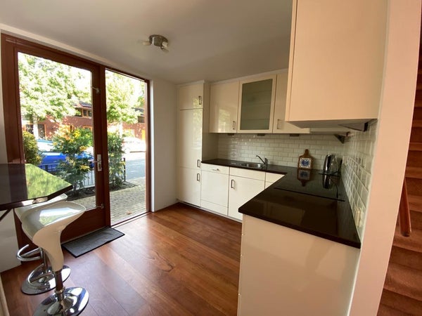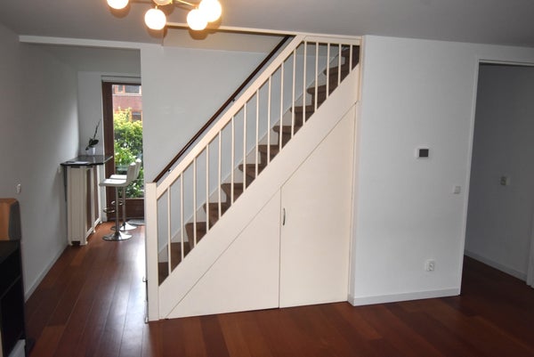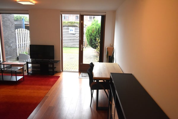 Voortuin, entree woning, hal met garderobe, meterkast, betegeld toilet met fontein. Ruime woon-/eetkamer met bergkast/trapkast en toegang naar de zonnige achtertuin (ZW) met achterom en houten berging (met daarin 2 fietsen, beschikbaar voor de huurder). Aan de voorzijde van de woning ligt de moderne keuken, in L-opstelling, met composiet aanrechtblad, RVS afzuigkap en div. inbouwapparatuur met o.a. koel- vriescombinatie, vaatwasser, 4 pits inductie kookplaat en combi-oven. Tevens is daar een deur naar de voortuin. De begane grond is voorzien van een mooie houten vloer. De eettafel bestaat uit 2 delen, waarvan 1 boven staat. Deze kunnen worden samengevoegd tot een grote eettafel met voldoende stoelen.