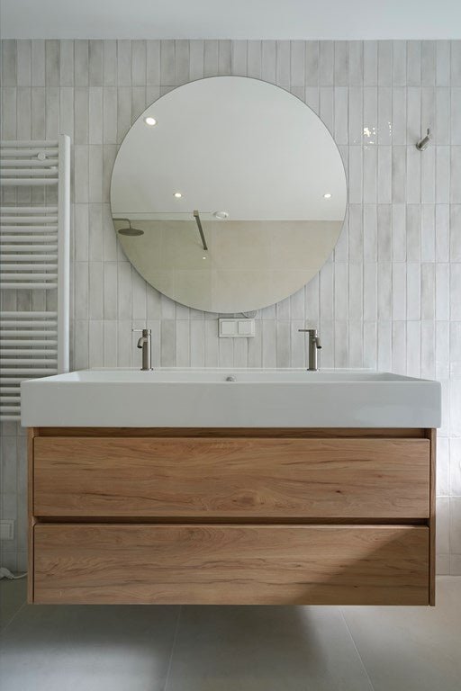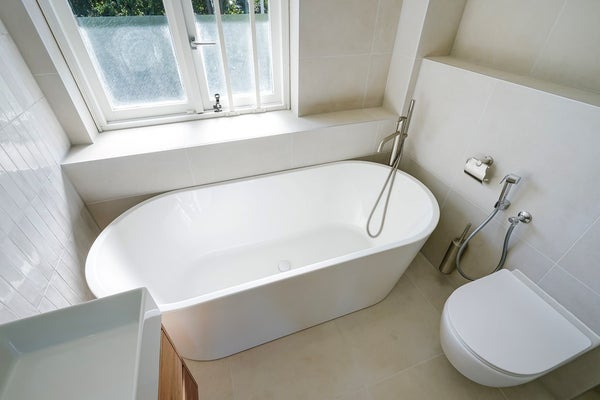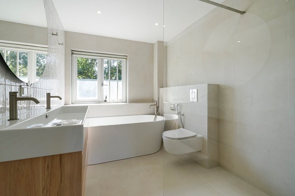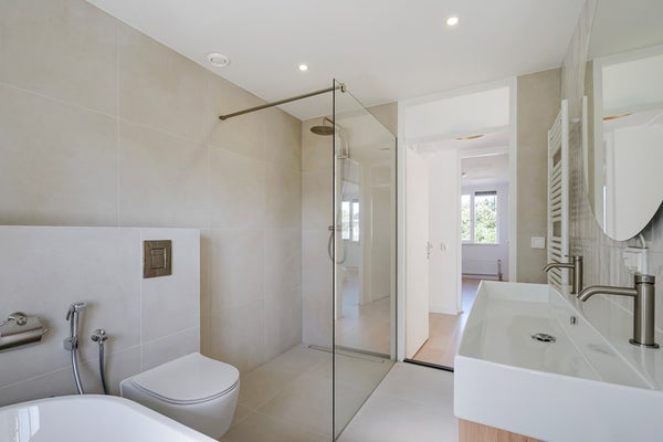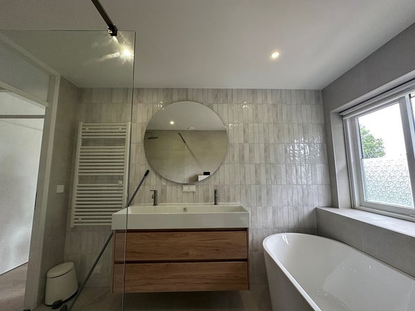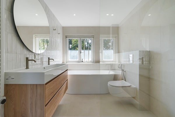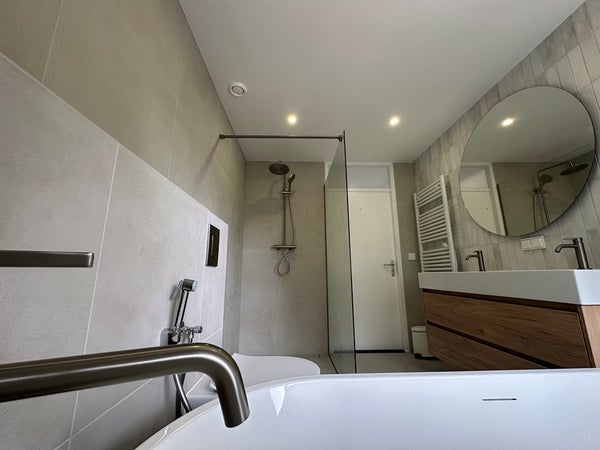 Badkamer: Moderne nieuwe badkamer met ligbad, wastafel, douche, toilet.