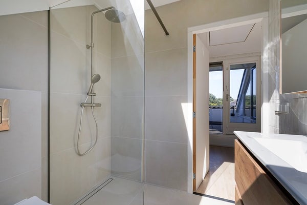 Ruime overloop met wasruimte en opstelplaats CV-combiketel (Atag, bouwjaar 2010) en veel bergruimte, toegang tot ruim dakterras met prachtig uitzicht over de duinen, vierde slaapkamer. En een moderne nieuwe badkamer met douche, toilet en een breed wastafelmeubel.
